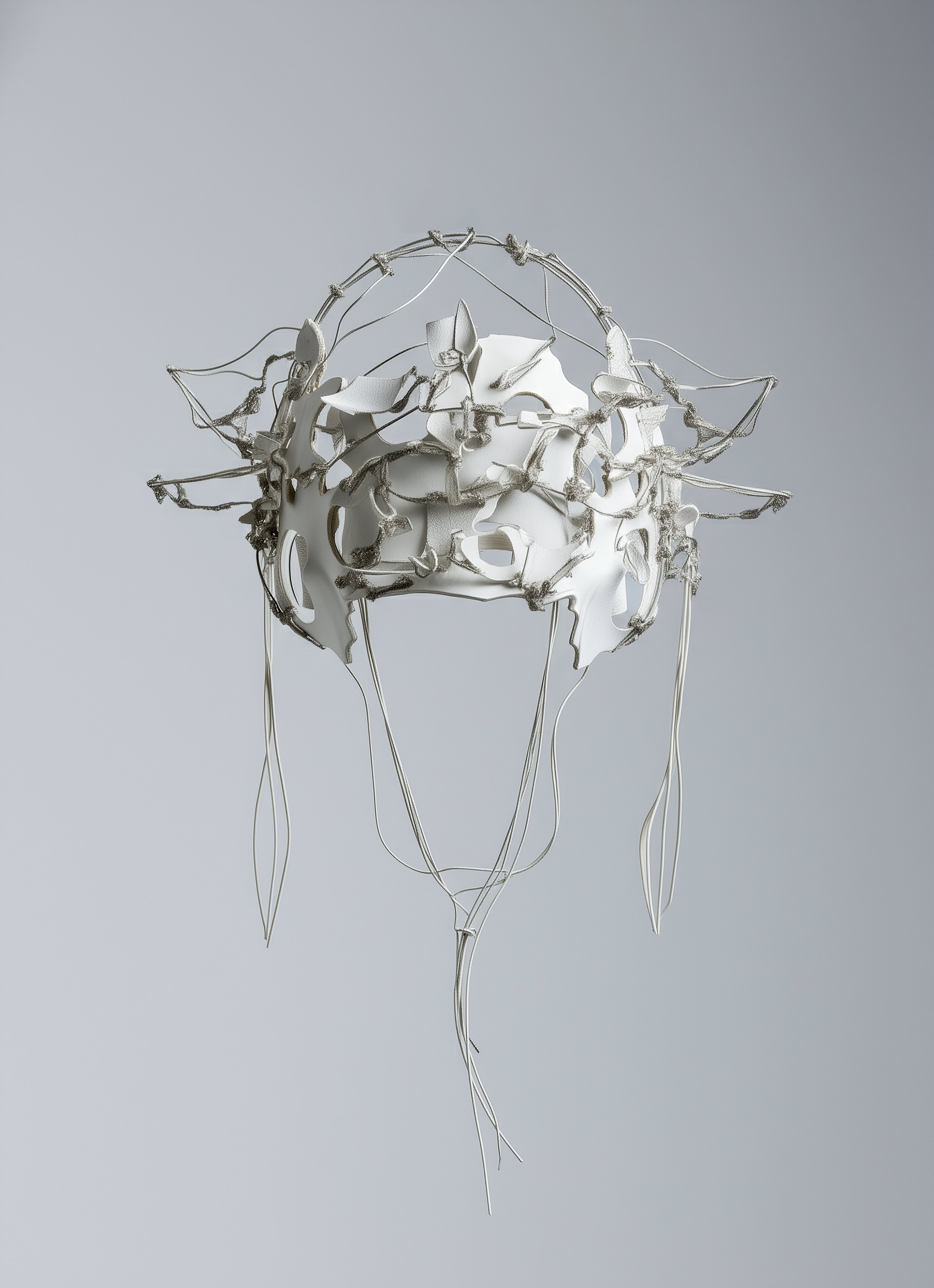 choice of materials takes cue from the terrains - stitched together through metallic wires that forms the ‘veins’ of the design. folding white metal creates an uneven surface that is seemingly reconciled by the wires. compositionally, it creates an aesthetic / cosmetic shell assembled from its pieces.
